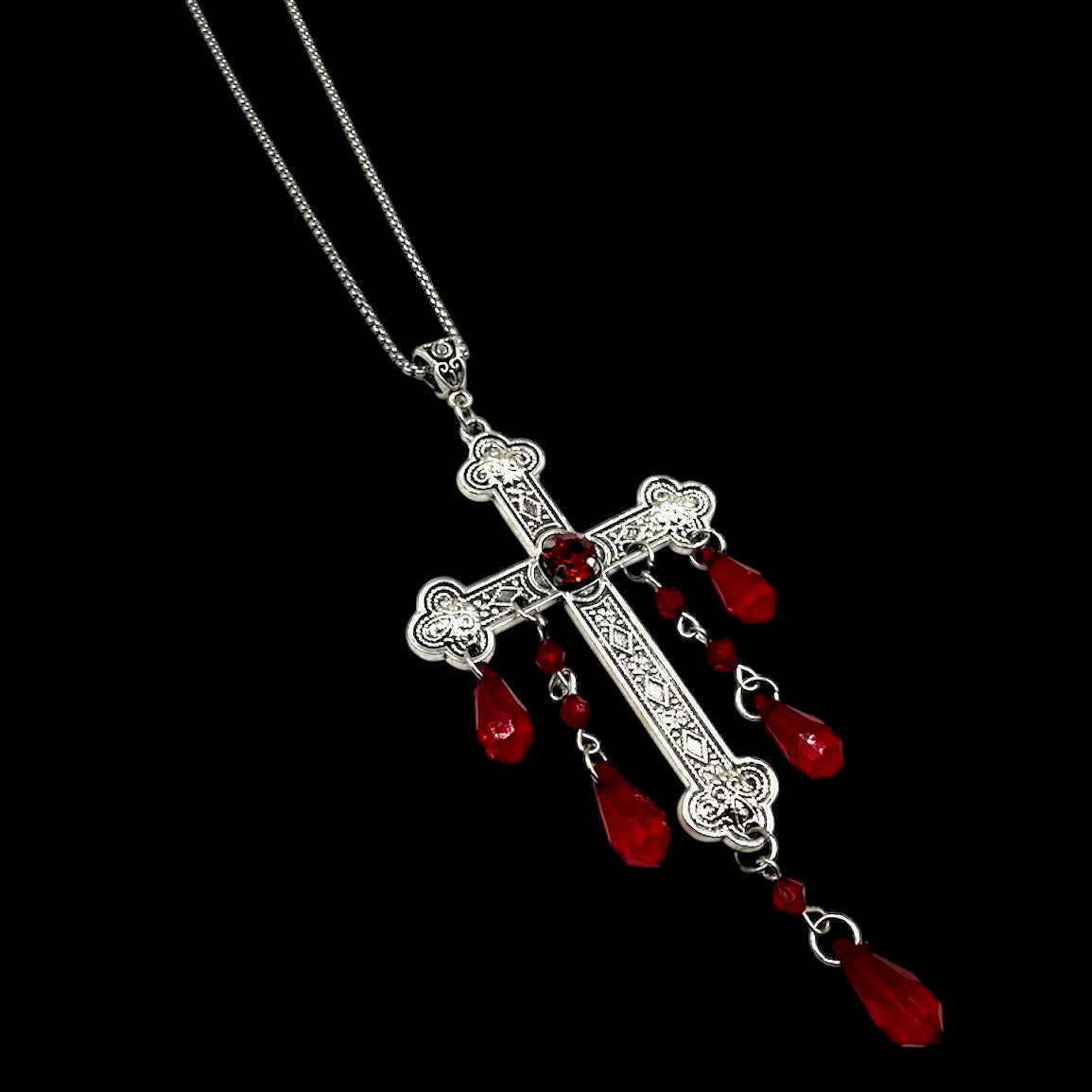 This silver cross necklace is inspired Nosferatu, designed with intricate detail, the cross symbolizes the one Ellen was gifted by Anna as a token of protection against the malevolent forces of Count Orlok. The cross is adorned with deep red glass beads that drip downward, reminiscent of blood—a chilling reference to the moment when blood pours from Ellen’s eyes and mouth in the film. The combination of the protective symbol and the eerie blood-like details creates a powerful connection to the film's gothic atmosphere. Perfect for fans of Nosferatu classic horror, or those drawn to dark, symbolic jewelry, this necklace is a striking tribute to one of cinema's most enduring and eerie love stories.