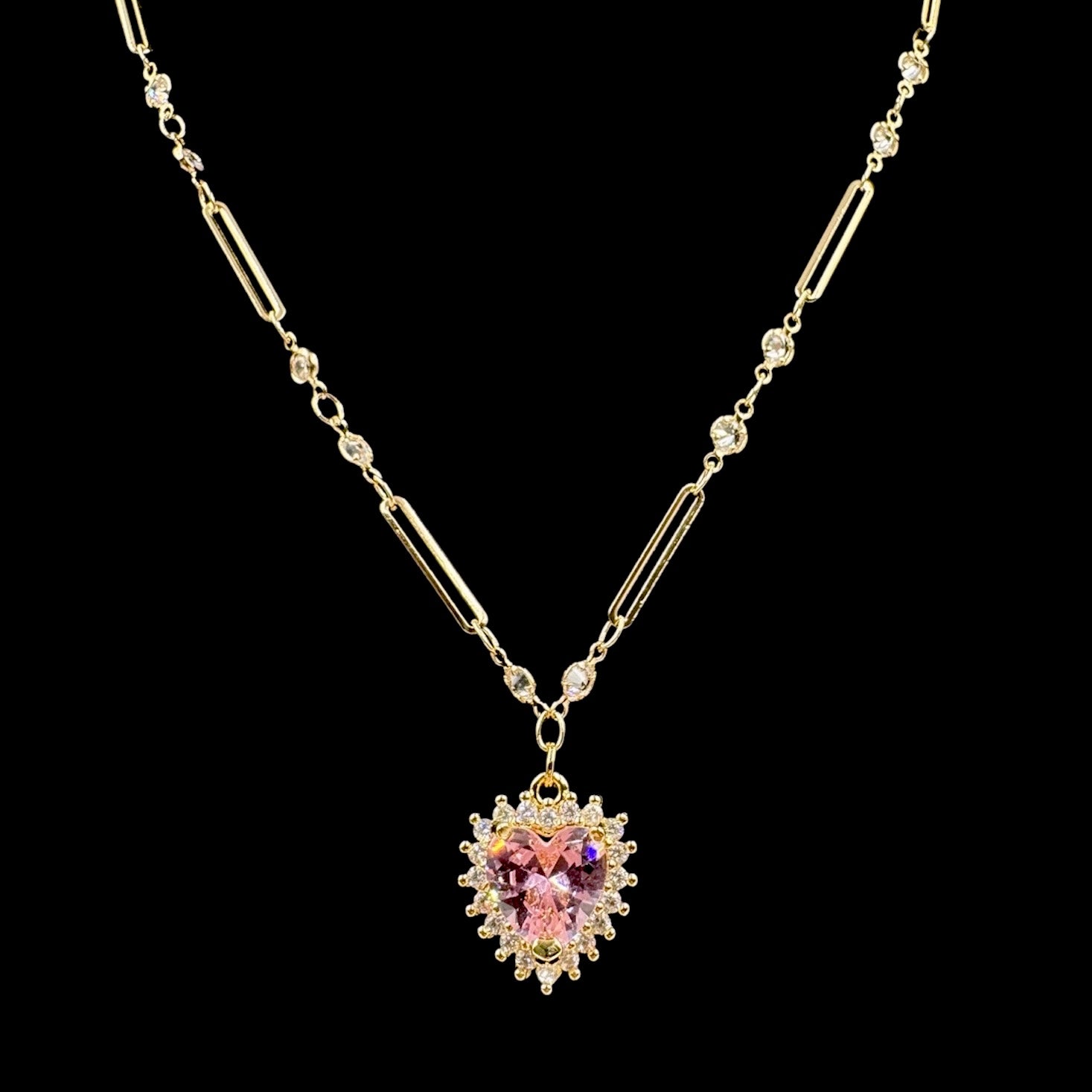 Gold Pink Diamond Heart Crystal Necklace