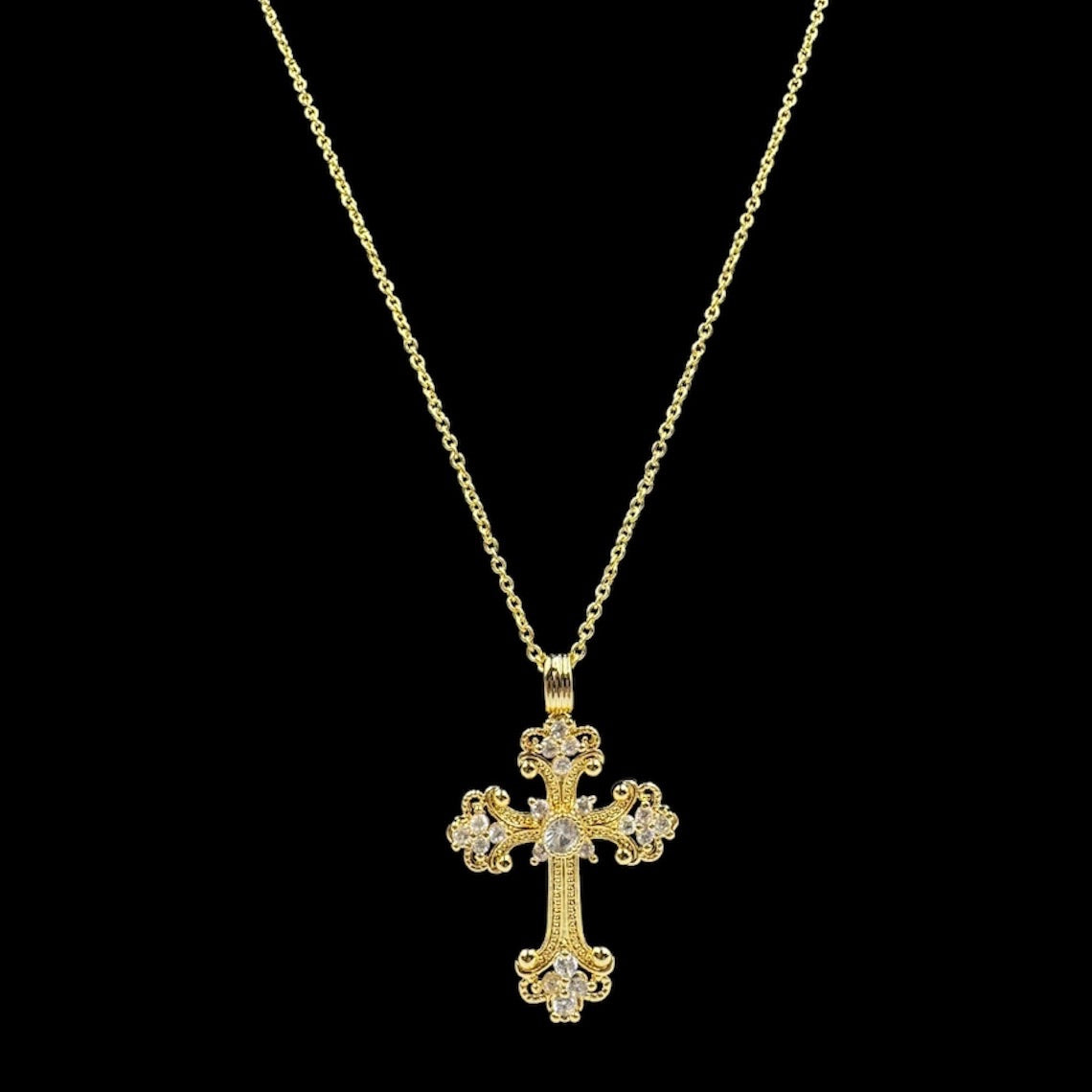 The Ornate Chunky Cross Necklace is a bold and striking piece inspired by crosses adorned with elaborate decorations and intricate designs. Featuring a stunning arrangement of sparkling crystals and detailed embellishments, this necklace embodies the timeless beauty and grandeur of traditional ornamental crosses. The chunky design adds a modern edge to the classic symbol, creating a statement piece that exudes both strength and elegance. This necklace is sure to elevate any outfit with its captivating presence and luxurious feel.