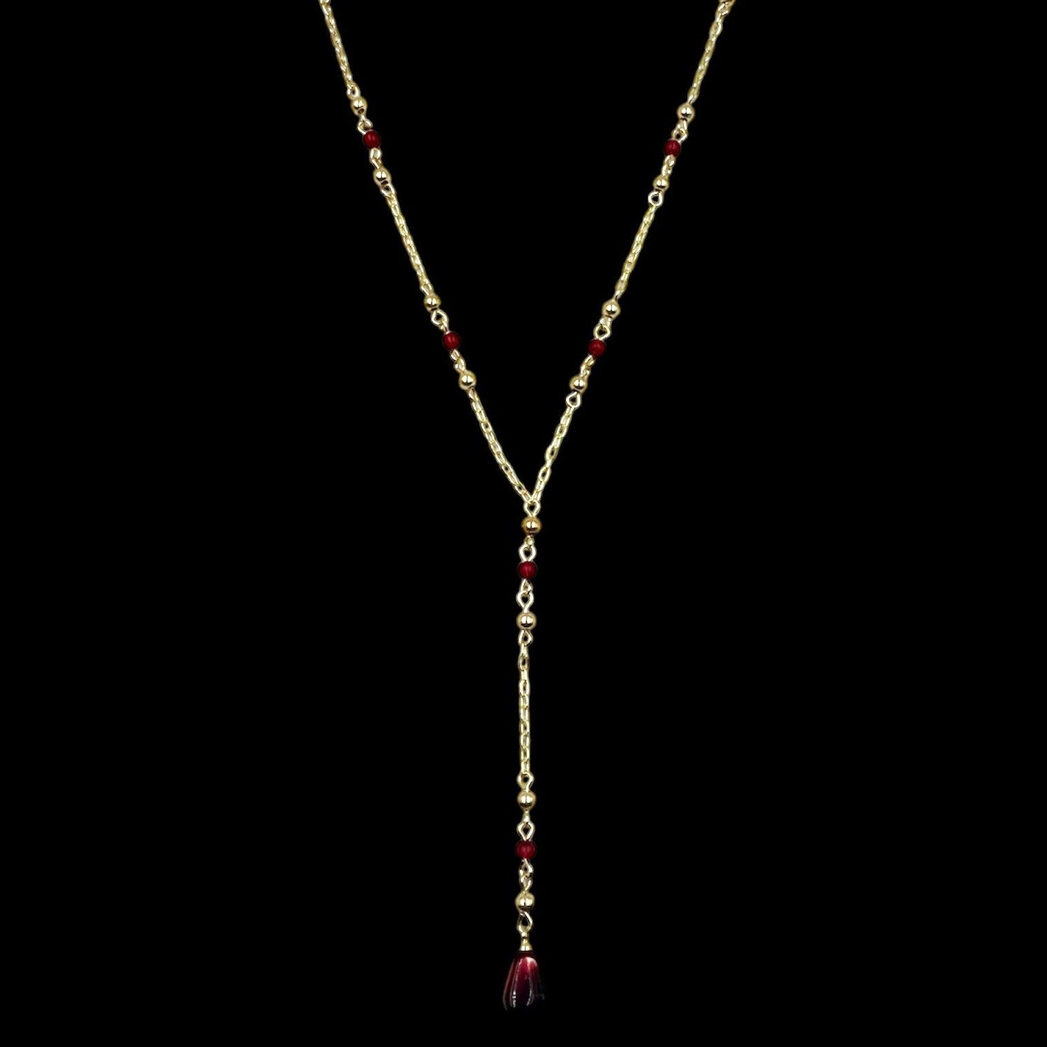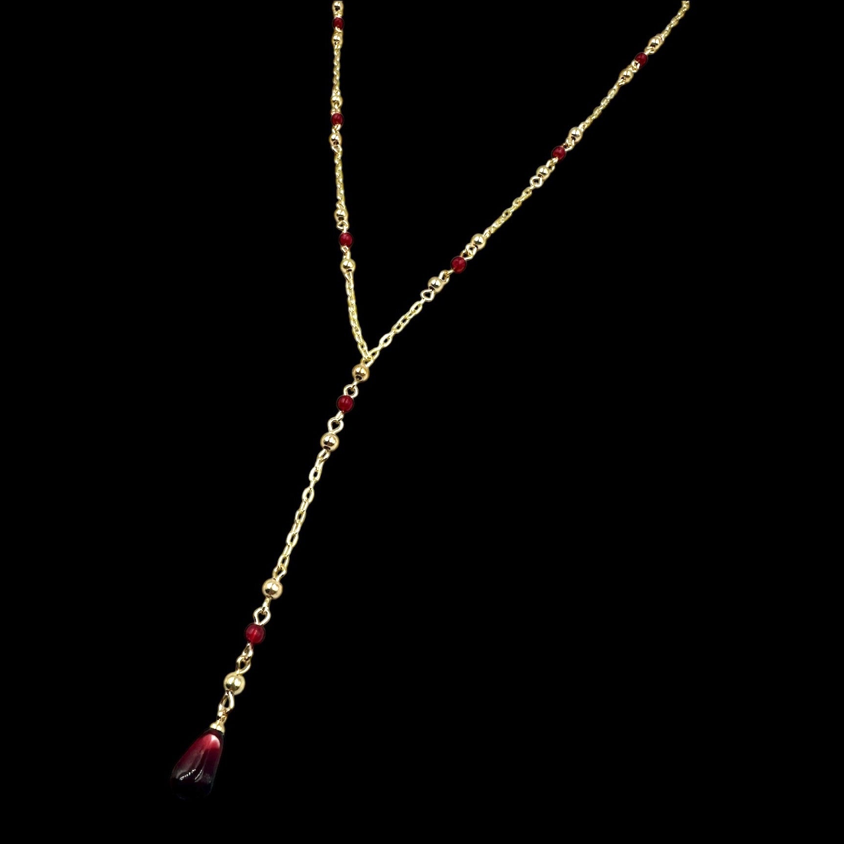 This Pomegranate Seed Rosary is inspired by the ancient Greek myth of Persephone. The pomegranate seed represents one of the six seeds that Persephone ate, which bound her to the underworld for six months each year.