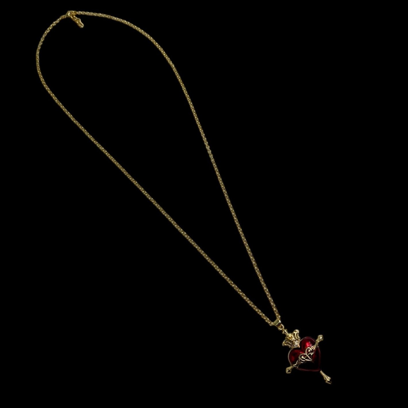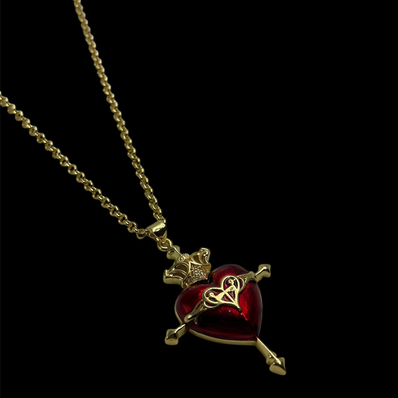 This necklace features a deep red heart-shaped pendant with a sculpted crown resting at the top. A cross-shaped design extends through the heart horizontally and vertically, giving the piece a strong, structured silhouette while adding layers of symbolic detail. The rich red center contrasts with the gold accents, enhancing its bold, regal presence.The crowned heart and intersecting cross create a design that feels both royal and devotional.