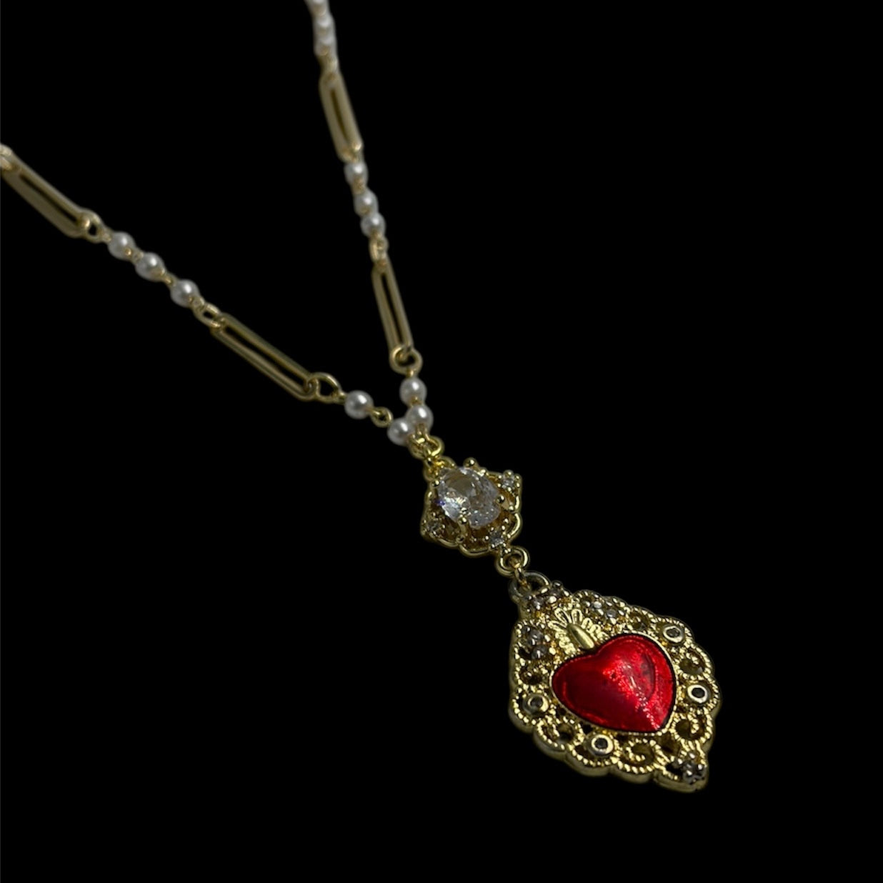 This necklace features an ornate heart design. Along the chain, small pearl accents are spaced between elongated gold links, adding texture and a delicate contrast. At the center, a diamond like faceted stone is set in an intricate gold frame, creating a soft focal point before leading down to the ornate heart set within an ornate gold border, detailed with decorative filigree and subtle raised accents.