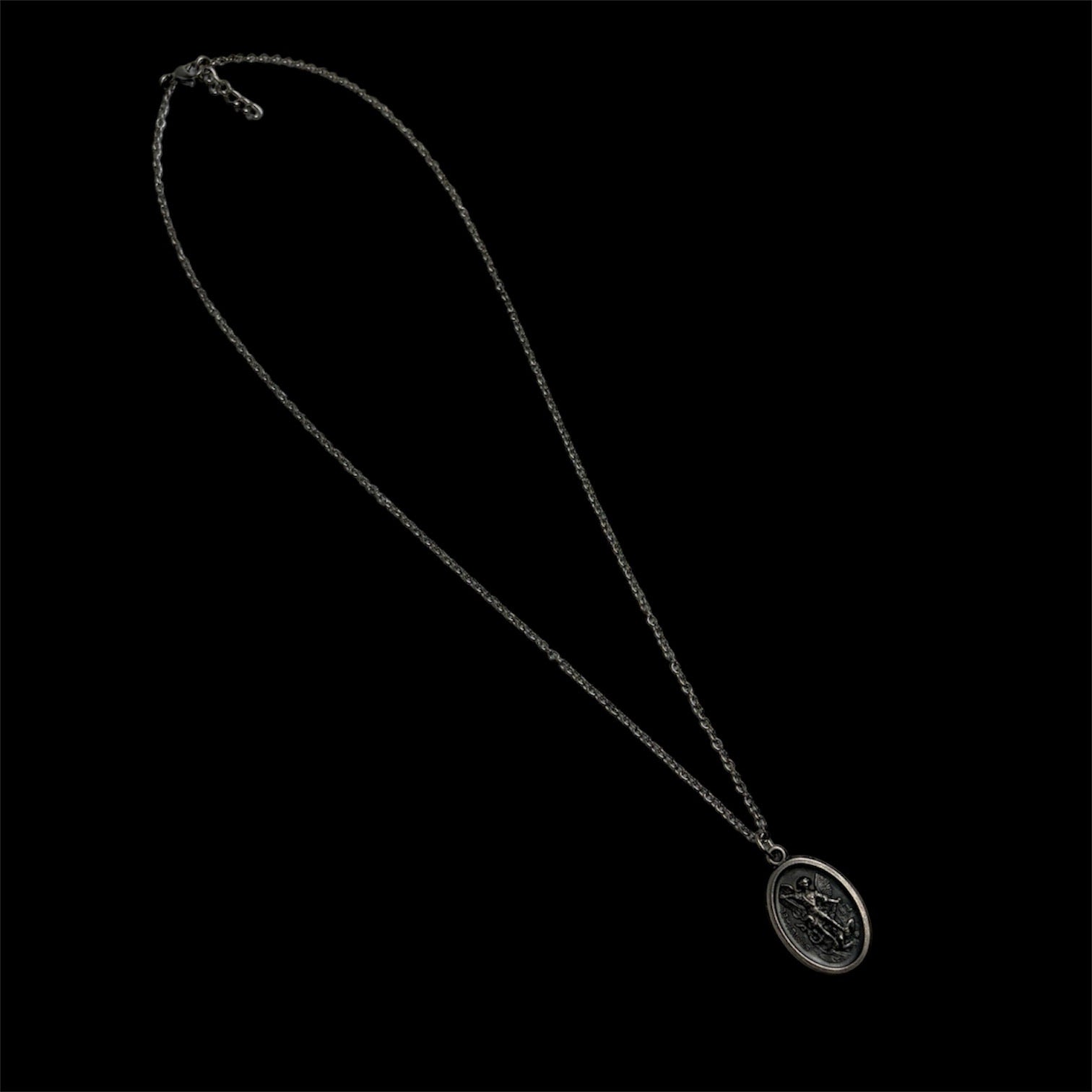 This oval coin-style necklace features an engraved depiction of Saint Michael triumphing over the demon, capturing the courage and protection associated with the archangel. The back of the pendant is engraved with the phrase “Pray for us”.