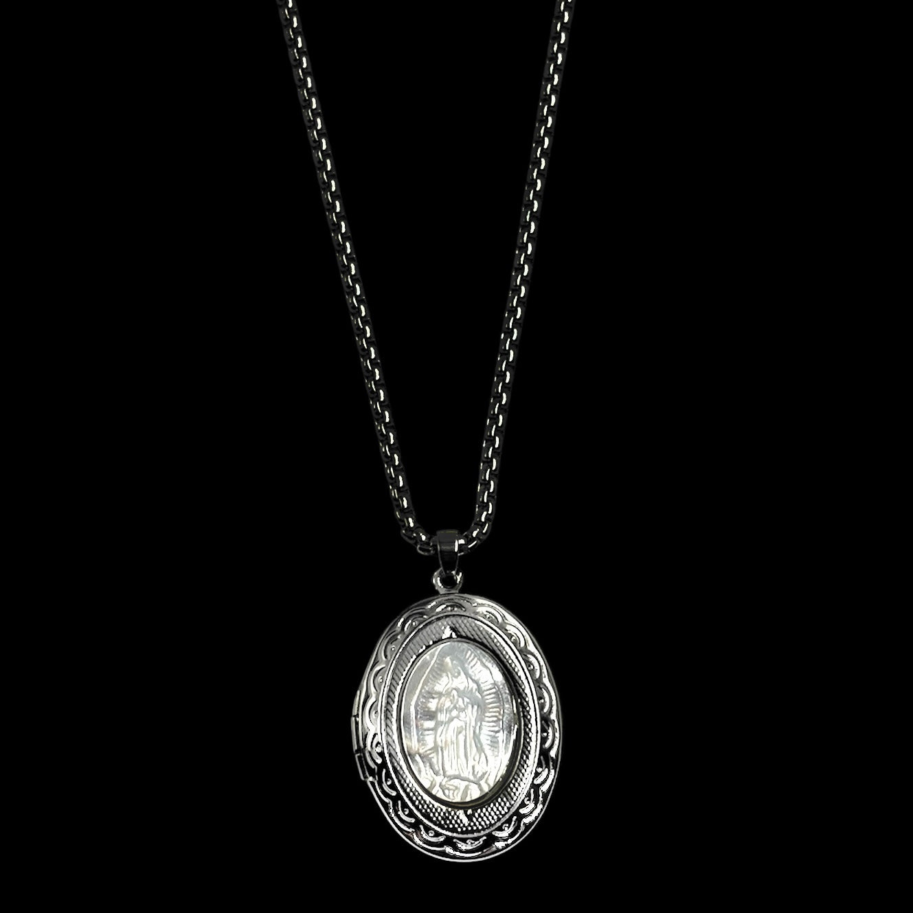 At its center, the Lady of Guadalupe is delicately depicted on a luminous pearlescent, iridescent glow that feels almost ethereal. The surrounding silver-toned frame features intricate detailing, giving the locket a vintage heirloom quality.