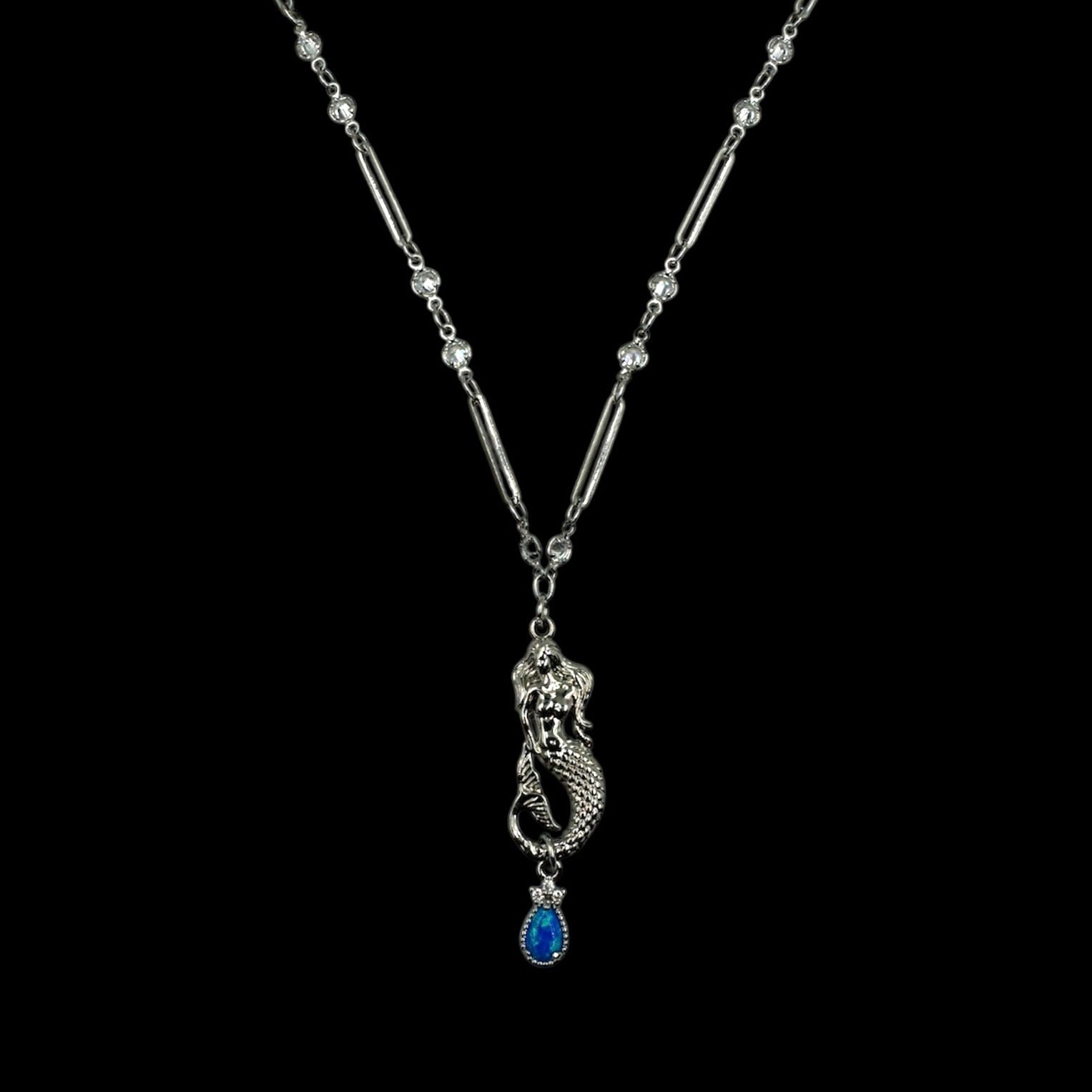 This necklace is inspired by the enchanting sirens from Greek mythology. Suspended from a crystal-studded chain, the pendant features a beautifully detailed silver siren with a flowing mermaid-like tail. A mesmerizing blue opal droplet dangles from her tail. Sirens were known for their hypnotic songs that lured sailors into the sea—a symbol of irresistible power and temptation. Perfect for those drawn to the ocean’s mystique and the raw magic of the dark feminine.
