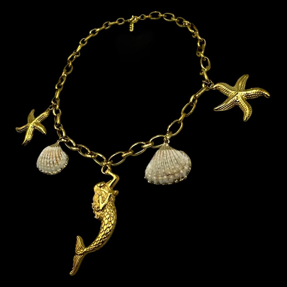 Inspired by the enchanting mystique of Greek mythology, this necklace showcases a golden siren pendant, complete with an intricately sculpted, mermaid-like tail that appears to swim delicately up your neck. Accompanying the siren are sea shells with gold accents at the base. Starfish charms sit beside the sea shells. These elements are suspended from a chunky chain, reminiscent of the robust links used by sailors to anchor their ships. A mesmerizing homage to the sea’s most captivating legends, this piece embodies the siren’s haunting beauty.