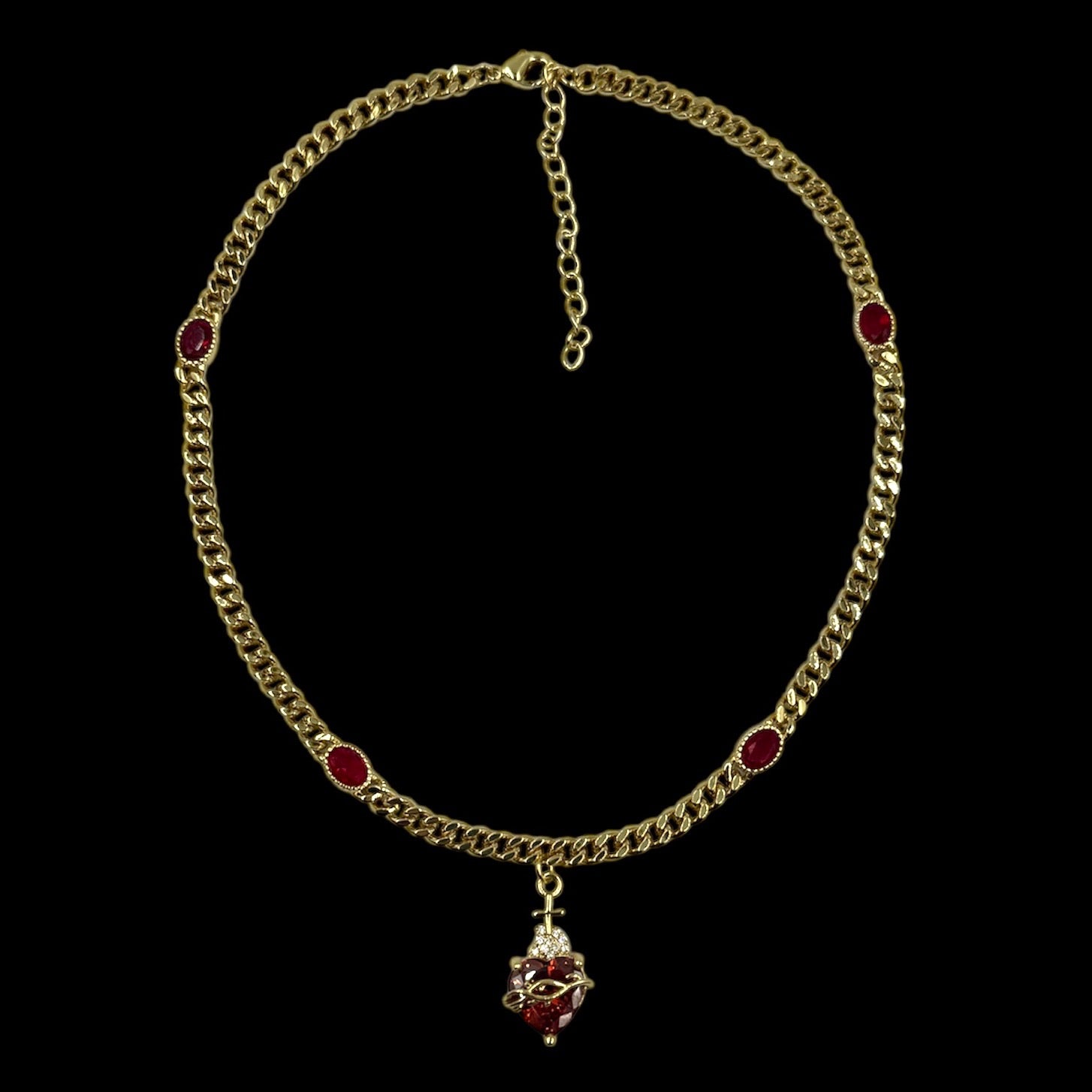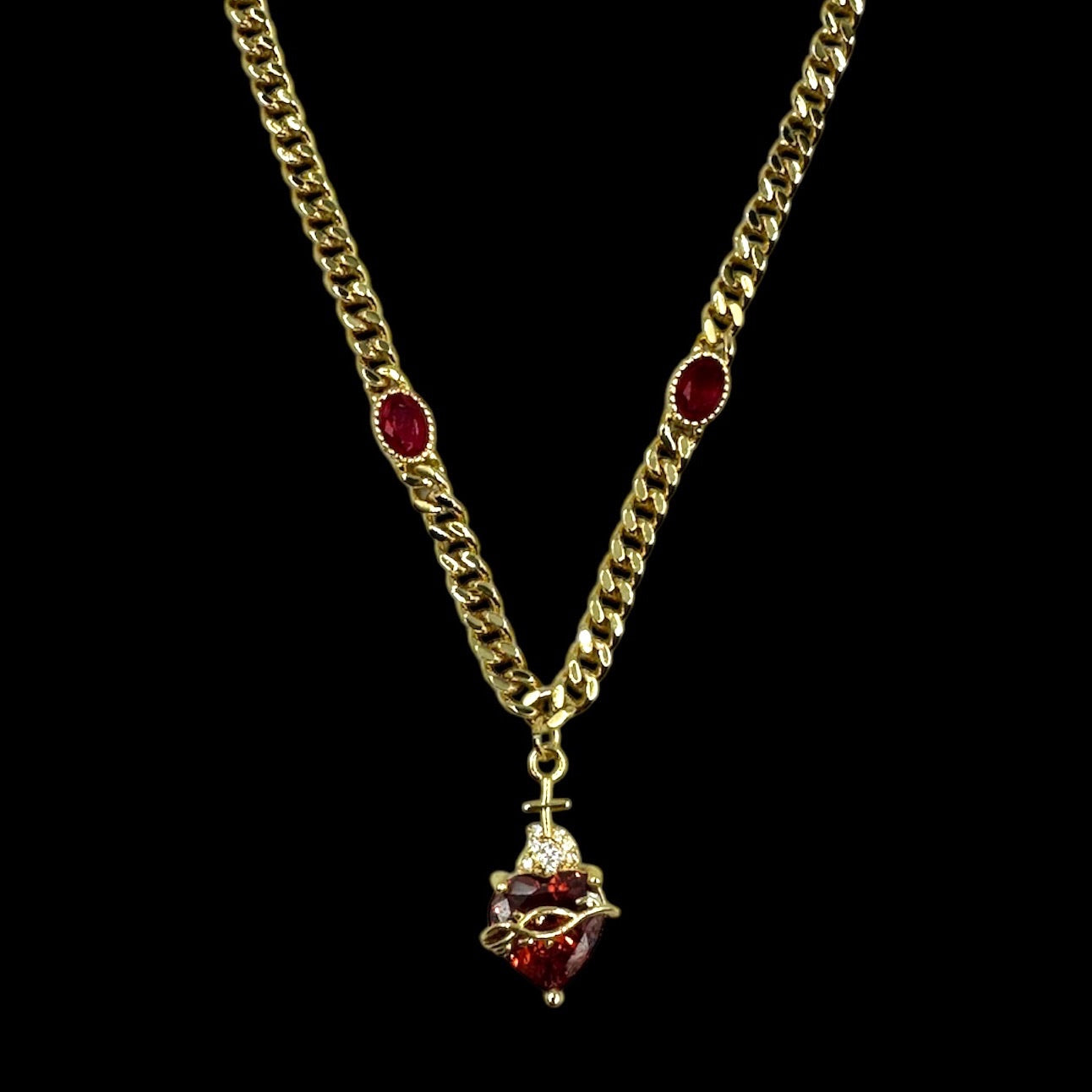 The Throned Sacred Heart Red Gem Chain Necklace blends regal elegance with religious imagery. Featuring radiant red gemstones within the chain and sacred heart pendant. The sacred heart is detailed with delicate throne-like design.
