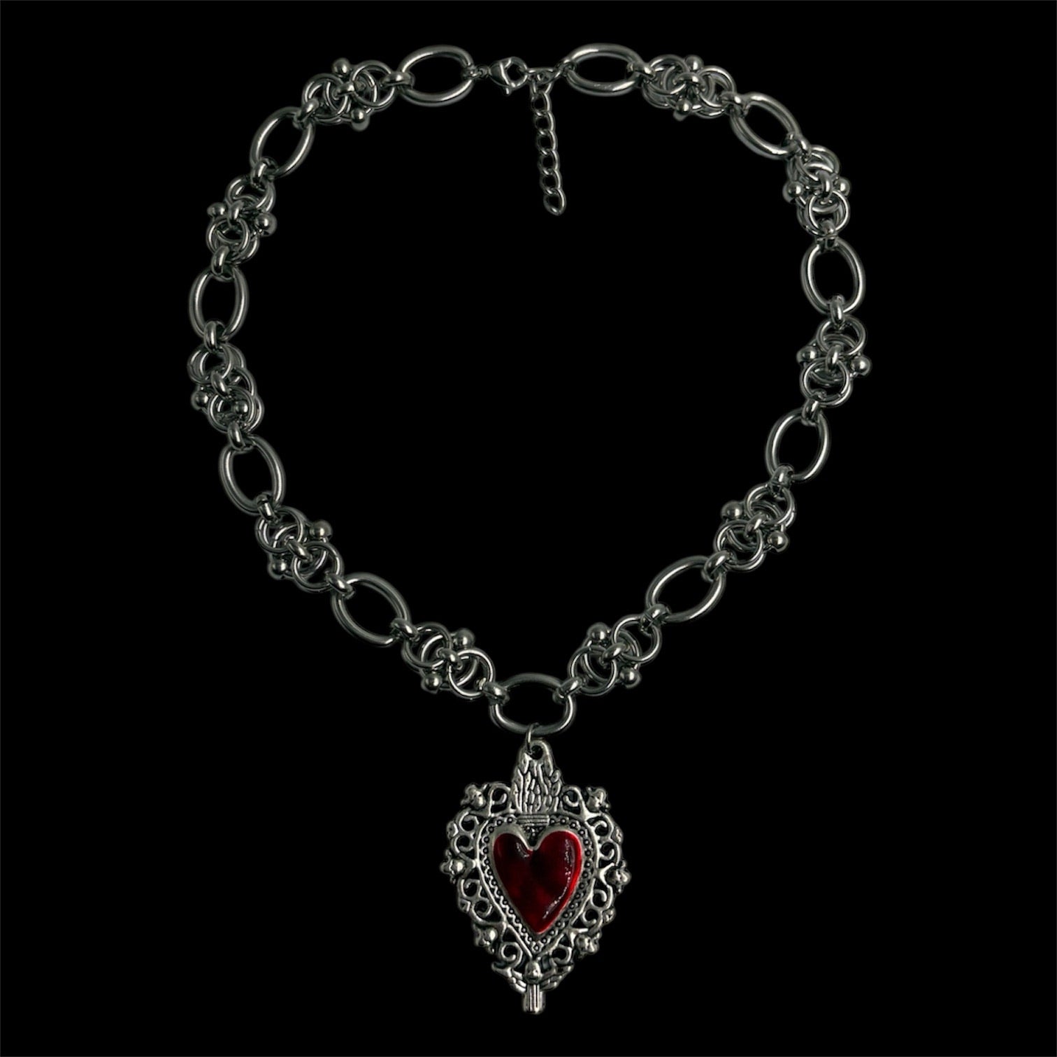 This necklace showcases a deep red heart encased within an ornate, silver-toned frame, detailed with subtle skull-like engravings. Suspended from a Victorian-style chainmail choker, the piece blends romantic elegance with gothic edge, creating a distinctly vampiric Victorian aesthetic.